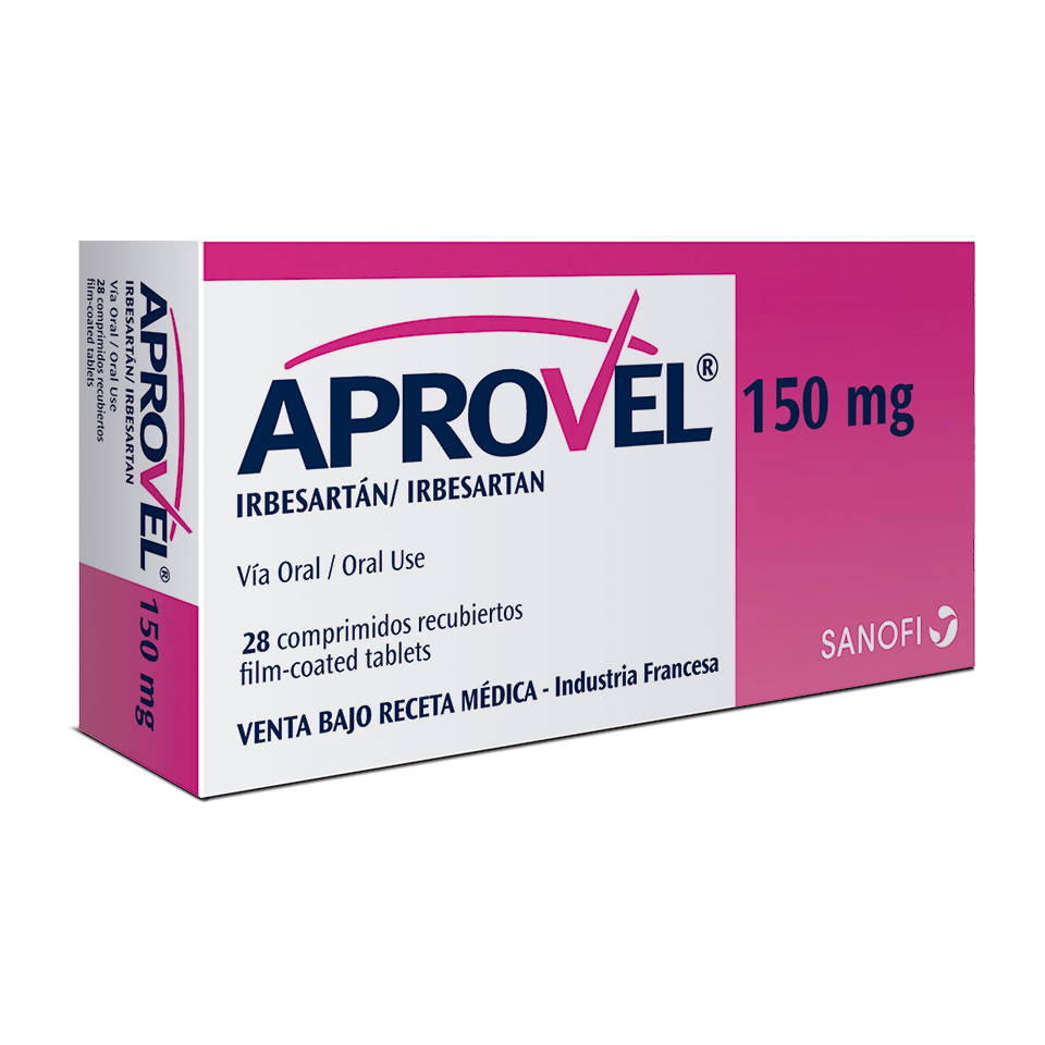 Aprovel® (Irbesartan) 150 mg, Sanofi, Tabletas recubiertas, caja con 28 tabletas