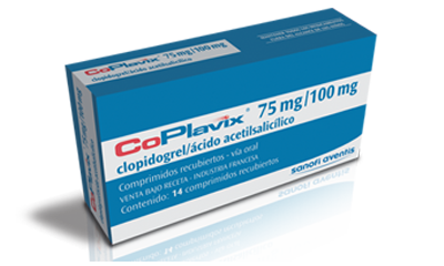 Coplavix® (Clopidogrel/Ácido Acetilsalicílico) 75 mg/100 mg, Sanofi, Tabletas recubiertas, caja con 28 tabletas