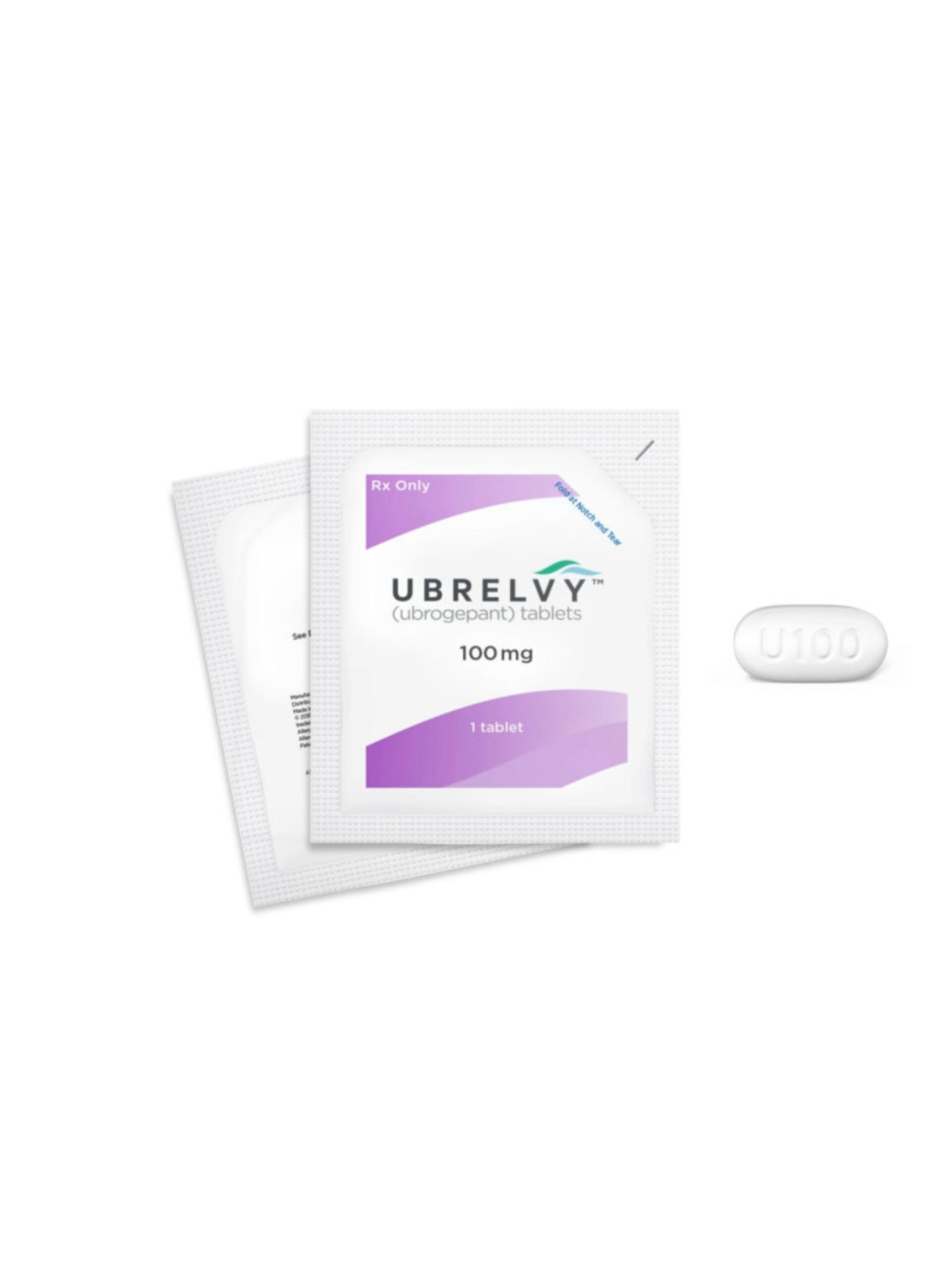 UBRELVY bloquea el péptido relacionado con el gen de la calcitonina (CGRP), ofreciendo alivio de migraña en 2 horas, con dosis de 50-100 mg tomada al inicio del ataque, opción de segunda dosis después de 2 horas, máximo 200 mg/día.
