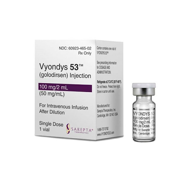 VYONDYS 53 induce skipping de exón 53 en pre-ARNm de distrofina, aumentando distrofina funcional en DMD amenable, administrado 30 mg/kg semanal IV, bajo aprobación acelerada con monitoreo renal e hipersensibilidad.